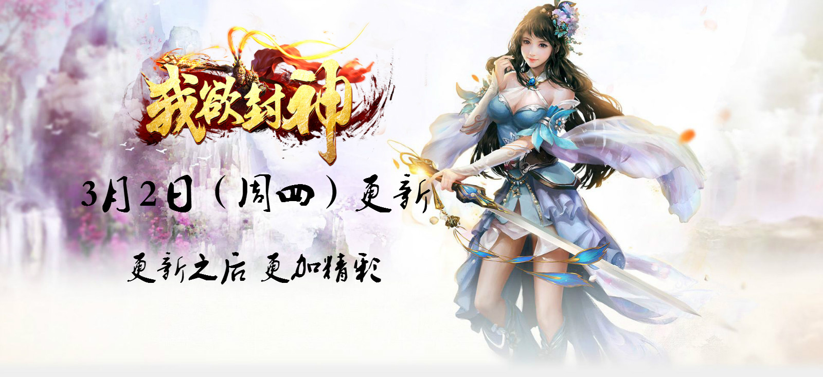 您好!游戏《我欲封神》将于2017年3月2日(周四)06:00进行停服更新,本次更新时间预计为3个小时,具体更新时间会根据实际情况提前或者延后。更新结束后重新登录即可体验新内容,请各位仙尊相互转告;感谢您对《我欲封神》游戏的支持!
